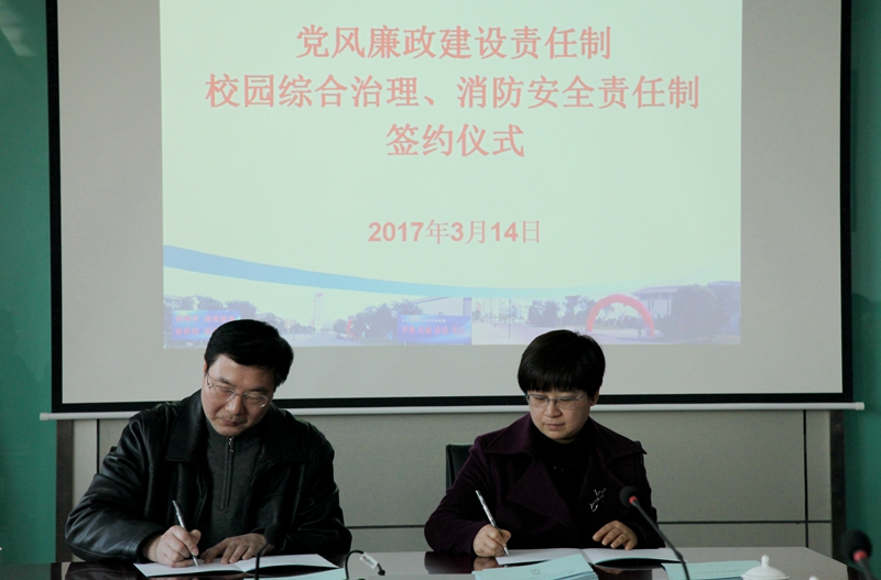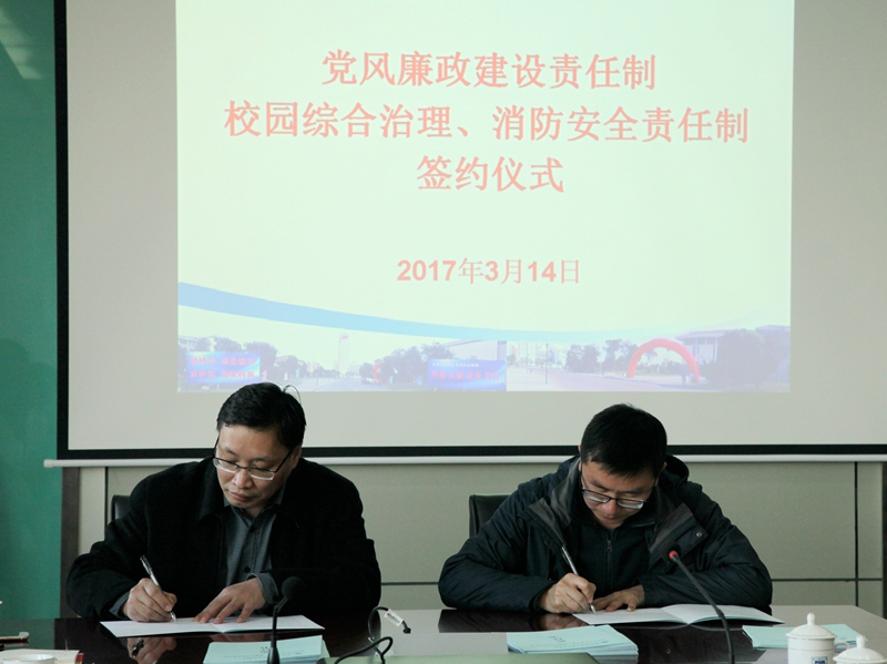 党委书记戴兆骏分别与各二级单位负责人签署《党风廉政建设责任书》;党委副书记王立辉也依次与各二级单位负责人签署《校园治安综合治理、消防安全领导责任制》责任书。