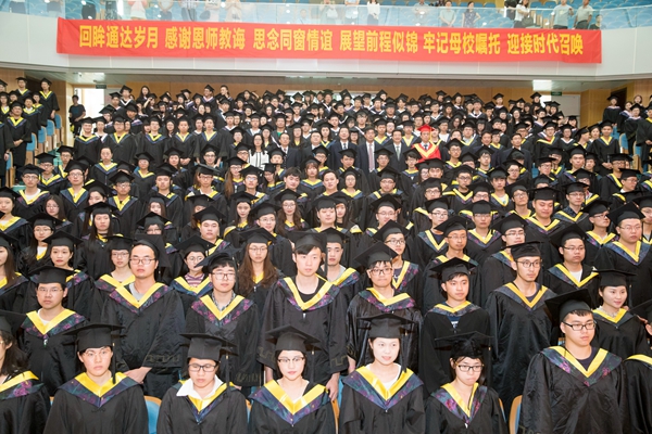 毕业典礼后,余珽、王承宽等领导与广大毕业生合影留念。