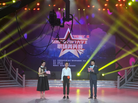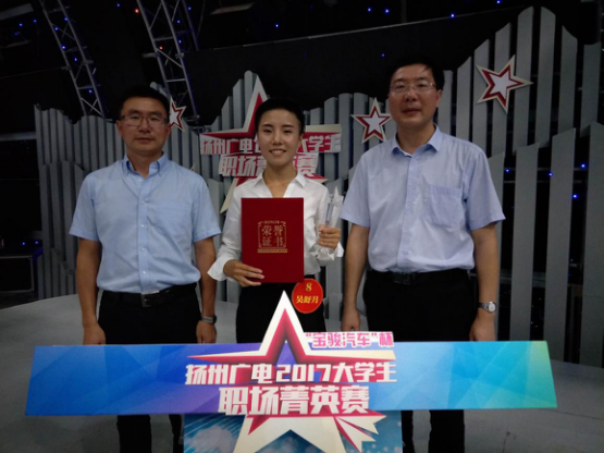 8月5日下午,由共青团扬州市委、扬州广电总台主办的扬州市2017大学生职场菁英赛总决赛在扬州广播电视中心演播厅举行,德赢官网2015级数字媒体技术专业学生吴舒月勇夺冠军。大赛邀请扬州团市委书记郭鹏驰,扬州广电集团副总编辑、新闻中心主任孙建昶,德赢官网党委书记戴兆骏等担任嘉宾并给获奖选手颁奖。