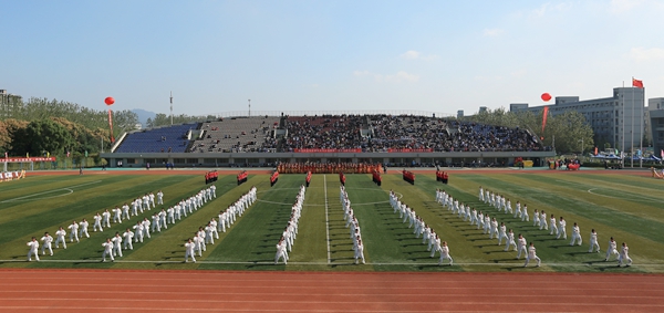 运动会开幕式上,彩旗飘扬,狮跃龙腾。德赢官网120人的师生代表方阵朝气蓬勃,意气风发,斗志昂扬,呐喊阵阵,迈着铿锵有力的步伐走过主席台,充分展现了德赢官网运动健儿锐意进取、勇往直前的精神风貌和教职工顽强拼搏、追求卓越的优良品质。由郭野老师和德赢官网230余名同学带来的武术表演《中华武术魂》,女生练长拳,男生舞刀术,铿锵有力,刚柔并济,一气呵成,尽展中华武术之魅力,更是赢得现场观众的阵阵掌声。