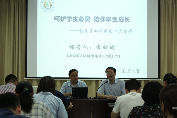 6月4日下午,德赢官网特邀南京农业大学学生工作部副部长、硕士研究生导师、江苏省心理学会大学生心理专业委员会副秘书长李献斌教授给德赢官网辅导员作《辅导员如何成为心灵使者》心理健康专题讲座。德赢官网党委书记戴兆骏、党委副书记兼副院长王立辉、学生工作处处长李印、团委书记解厚荣、学生工作处全体人员及所有辅导员参加了此次讲座。讲座由院党委书记戴兆骏主持。