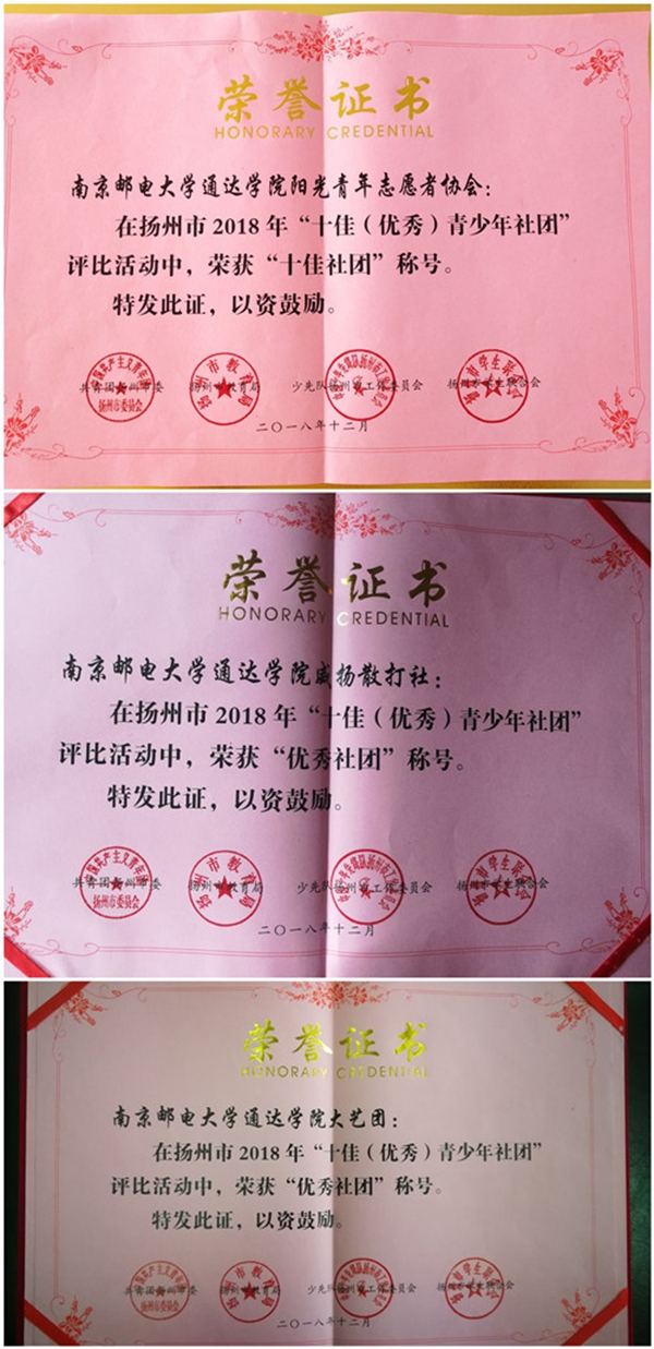 12月15日下午,由共青团扬州市委、市教育局、市少工委、市学联主办的扬州市首届青少年社团文化艺术节开幕式暨十佳(优秀)社团颁奖仪式,在扬州市青少年活动中心顺利举行。德赢官网阳光青年志愿者协会荣获扬州市十佳社团,大学生艺术团及威扬散打社荣获扬州市优秀社团。