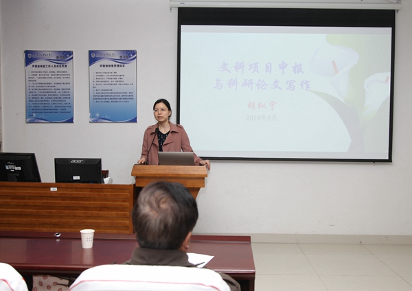 胡纵宇研究员的讲座题目是“文科项目申报与科研论文写作”。她首先介绍了人文社科项目的分类和区别,重点介绍了项目申报选题和申报书写作的基本思路和要求。最后,她详细讲述了人文社科类论文如何进行选题、材料收集、写作和投稿等内容。讲座结束后,她还针对现场老师提出的问题与大家进行了交流。