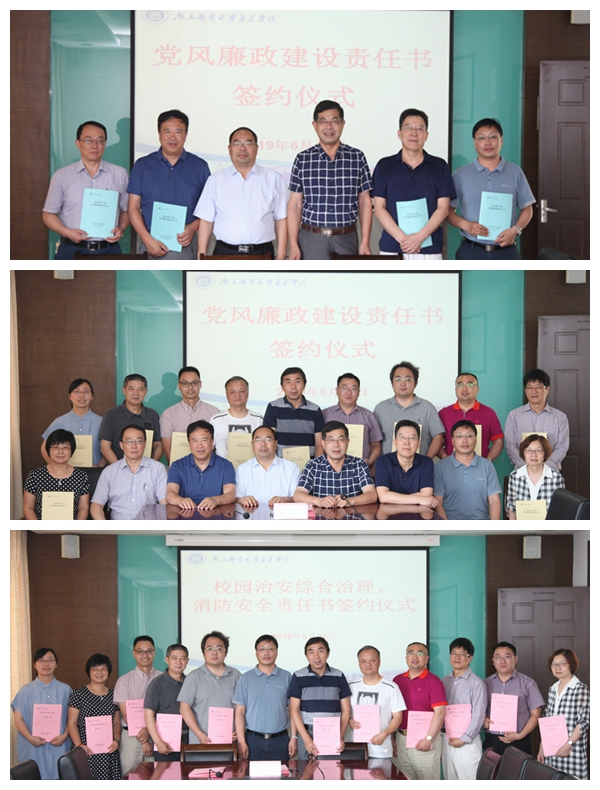 签约仪式上,院长王承宽、院党委书记汪业周与班子其他成员签订了《党风廉政建设责任书》,院党政领导与所分管的部门单位负责人分别签订《党风廉政建设责任书》;党委副书记、副院长王立辉与各二级负责人单位签订了《校园治安综合治理、消防安全责任书》。汪书记指出,全面从严治党和安全稳定工作一直是高校长抓不懈的重要工作,签订责任书传递的是一种责任、一种压力、一种要求,我们要加强两个“责任书”的贯彻落实,不断推进党风廉政建设和综合治理、安全稳定工作取得新成效,努力为全院师生干事创业营造一个风清气正、平安稳定、幸福和谐的校园。