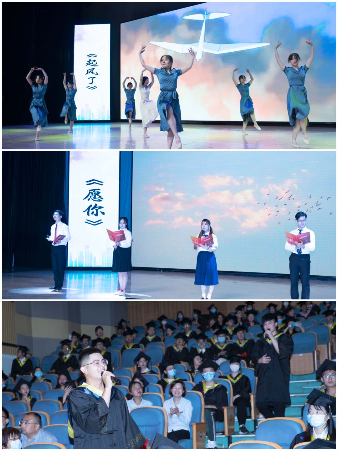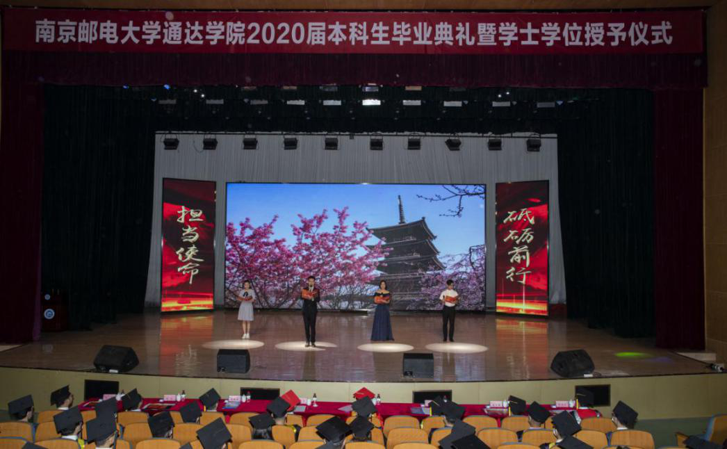 毕业典礼在《担当使命 砥砺前行》诗朗诵中拉开帷幕,在《不忘初心》歌曲中进入高潮。