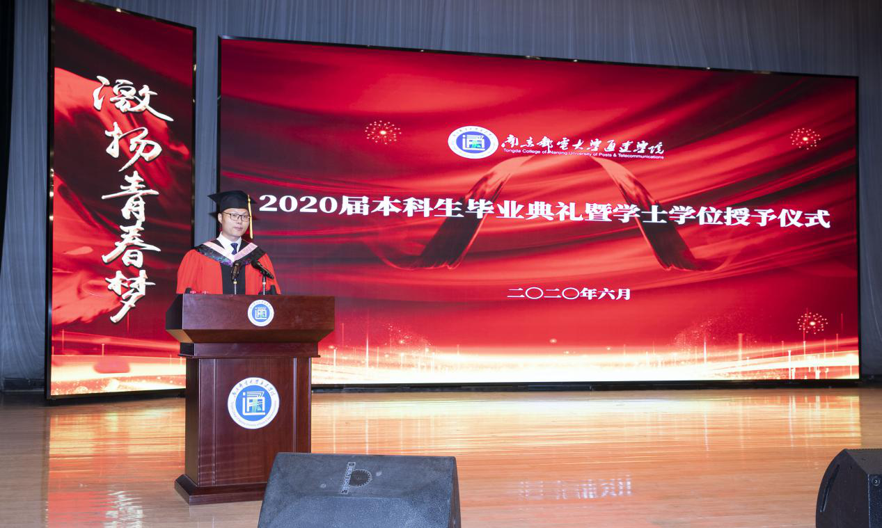 王承宽院长在致辞中代表学院,向全体毕业生致以最热烈的祝贺!向辛勤养育和悉心教导你们的父母、师长表示最崇高的敬意!他分别以院长、老师、长者三种角色,为学生历经四年学习,练就了赢得未来的本领而喝彩;为学生历经疫情磨砺,增添了战胜困难的力量而点赞;为学生历经岁月磨砺,领悟了通天达地的真谛而祝福!临别之际,他用三句话作为临别赠言送给2020届全体毕业生,第一句是春华秋实,历经蜕变方能感受成长;第二句是纵观历史,迎难而上方能成就强大;第三句是初心如磐,注重修为方能登高望远。他祝福和期盼2020届全体毕业生要注重热爱、敬畏、坚韧这三种修为,切实践行“努力在危机中育新机、于变局中开新局”的战略论断,切实抓住职业黄金期与民族伟大复兴期叠加的难得机遇,以破茧而出的本领、灾难磨砺的力量、飞龙在天的豪迈,一飞冲天、一路通达、一生幸福!