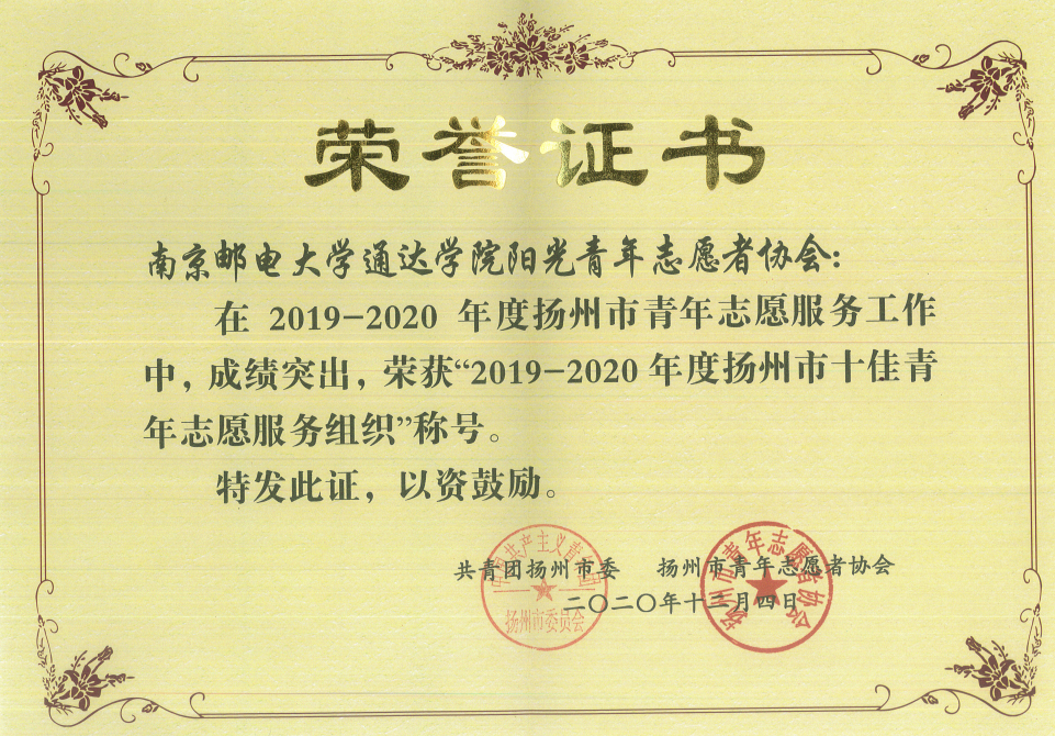 近日,共青团扬州市委、扬州市青年志愿者协会联合下发了《关于表彰2019—2020年度扬州市优秀青年志愿者、志愿服务组织、志愿服务项目的决定》(团扬委联〔2020〕31号),德赢官网阳光青年志愿者协会会长刘浩楠荣获“扬州市十佳青年志愿者”称号,德赢官网阳光青年志愿者协会荣获“扬州市十佳青年志愿服务组织”称号。