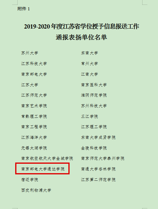 近日,江苏省学位委员会办公室发布了《关于通报2019-2020年度江苏省学位授予信息报送工作情况的通知》,德赢官网荣获“2019-2020年度省学位授予信息报送工作先进单位”,教务处司艺老师获评“2019-2020年度江苏省学位授予信息报送工作先进个人”。