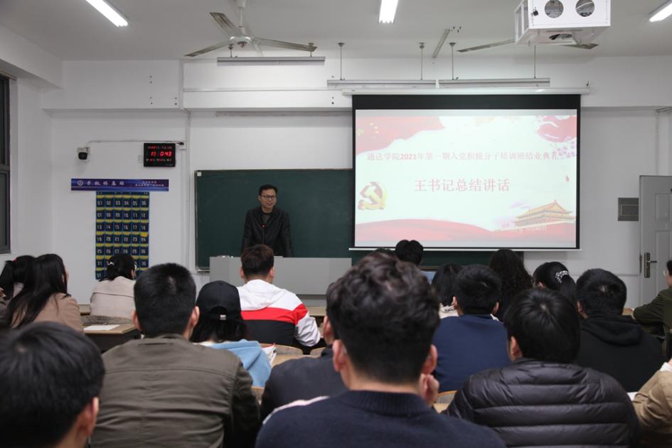 4月13日晚,德赢官网2021年第一期积极分子培训班结业典礼在扬教1306教室举行。院党委副书记兼副院长王楷、党委工作部副部长任建蕊出席了结业典礼。