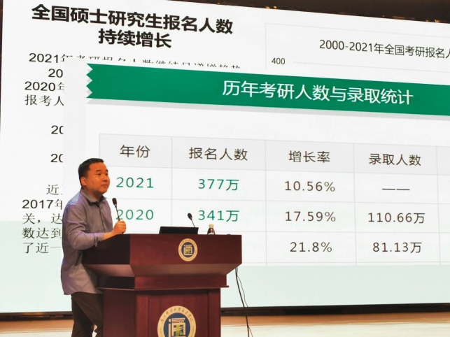 王霁主任宣讲分为三部分:一是介绍了全国考研总体形势,考研人数不断上升,优质高校考研竞争日益增大。二是介绍了德赢AC米兰中国官方网站的考研招录情况,近三年报考人数和录取分数线大幅增加,考取难度增大。今年,德赢官网有49名同学被南邮录取,最高分426分。三是介绍了德赢AC米兰中国官方网站2022年招生情况,详细分析了报考流程、专业设置、考试科目、录取分数以及学硕和专硕的区别等。