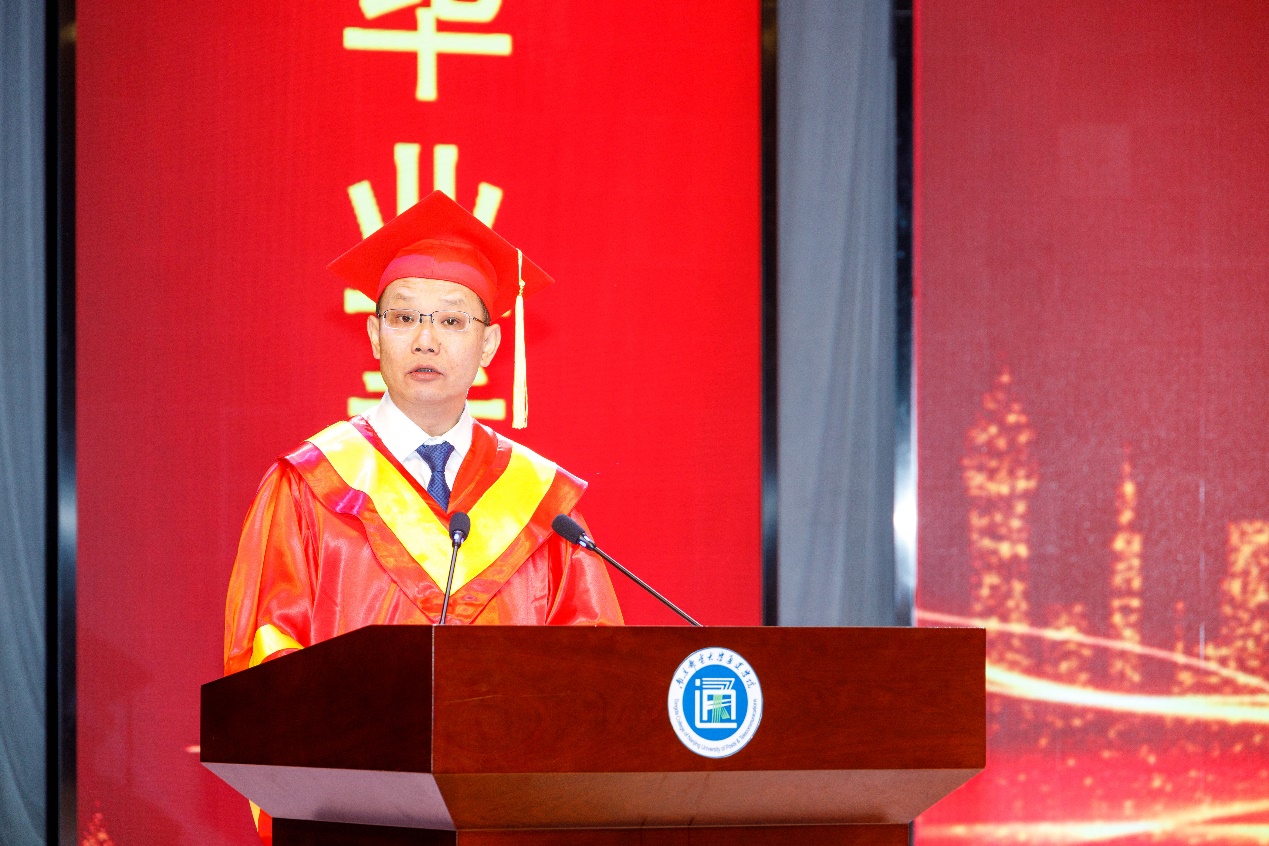 在热烈的掌声中,王院长致辞2021届毕业生。他代表全院师生员工,向全体毕业生表示热烈的祝贺,向老师和管理服务人员表示衷心的感谢,向倾力倾心培育同学们成长成才的父母表示崇高的敬意!他深情回顾了同学们在校园中学习、生活的点点滴滴,感谢同学们对学院发展建设作出的积极贡献。特别提到有327人考取了国内外研究生,通信工程专业升学率超过30%;其中通信工程专业171203班升学率达到了54.84%;数百名毕业生获得了知名企业录用;还涌现出在全国大学生电子设计大赛,全国大学生数学建模竞赛,美国大学生数学建模竞赛,江苏省大学生创新创业大赛,中国机器人技能竞赛等国家级、省级赛事中屡创佳绩的优秀毕业生代表等。他点赞毕业生“你们用砥砺多彩的青春写在了母校,学院发展的每一篇华章,都浸润着你们的汗水和足迹。”他分别用母校为你们骄傲、喝彩、守候,我为你们鼓掌、点赞、祝福表达了对同学们的诚挚谢意和深深祝福!