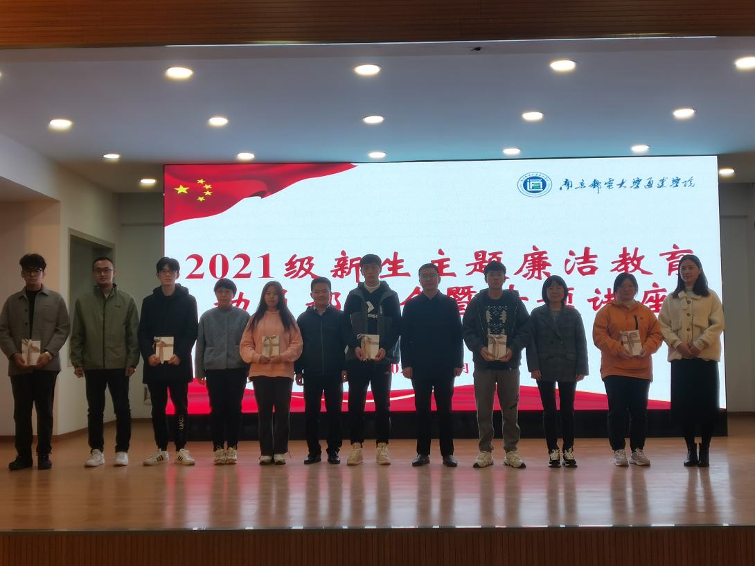 学工处处长解厚荣,二级学院党总支副书记司艺、陈思伽、毕强、范胜雪、沈冰冰向2021级新生代表赠送了《大学生廉洁教育手册》《纪律日课:党规党纪365问》,鼓励他们要做廉洁之人,秉持正气,恪守底线,立俭约志,立身守正。