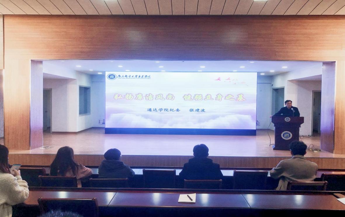专题讲座释“廉洁要义”。11月8日,学院召开“廉洁清风劲 扬帆新征程”2021级新生主题廉洁教育动员部署会暨专题讲座,观看教育视频、部署活动安排、赠送廉洁读本、进行廉洁宣誓。院纪委书记张建波作了题为《弘扬廉洁风尚 建强立身之基》的专题讲座,围绕“重温正风肃纪反腐的六个第一”“十八大以来的中国廉政实践”“大学生廉洁教育的思考及启示”三个方面展开,重点讲述了大学生不廉洁修身的表现,并希望新生注重涵养清正廉洁品质,始终守住廉洁底线。