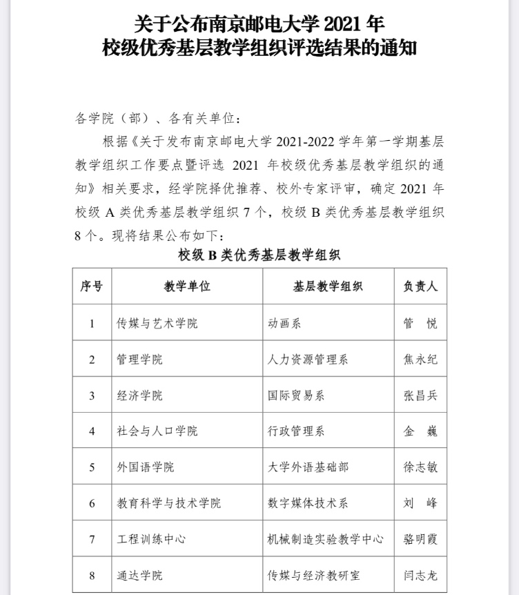 德赢AC米兰中国官方网站2021年校级优秀基层教学组织评选结果于近日公布,共评选出2A类优秀基层教学组织7个,B类优秀基层教学组织8个。德赢官网传媒与经济教研室顺利入选2021年度德赢AC米兰中国官方网站校级B类优秀基层教学组织。