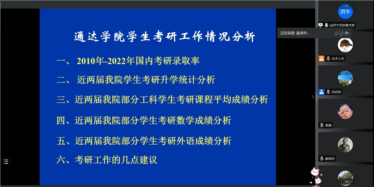7月7日晚,德赢官网组织开展了2019级学生考研动员大会。学院常务副院长赵洪牛、副院长刘允、相关职能部门负责人及670余名考研学子参加了本次活动。大会采用“腾讯会议”在线上进行,由学院党委副书记、副院长王楷主持。