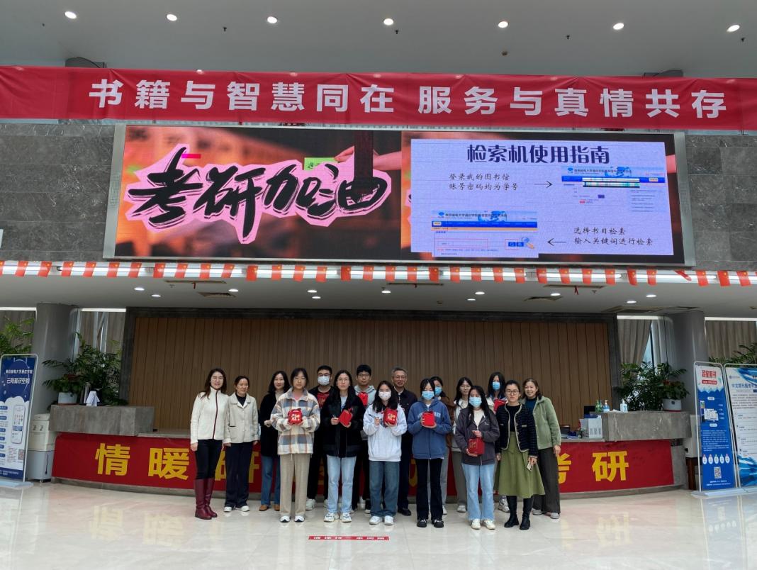 在考研倒计时的关键时刻,为了给坚持考研的学生加油鼓劲,帮助他们缓解备考压力,图书馆于11月22日上午开展了“情暖研途 助力考研”活动,为考研学生送祝福。常务副院长赵洪牛亲临现场,带领图书馆相关负责同志为考研学生送上“暖心盲盒”,并鼓励他们坚定考研信心,做好冲刺复习,保持最佳的备战状态。一份份精美的盲盒,有寓意“苹”安上岸的苹果、马到“橙”功的橙子、“棒”上有名的棒棒糖以及“逢考必过”的钥匙扣等,表达了图书馆对考研学生的真切祝福。