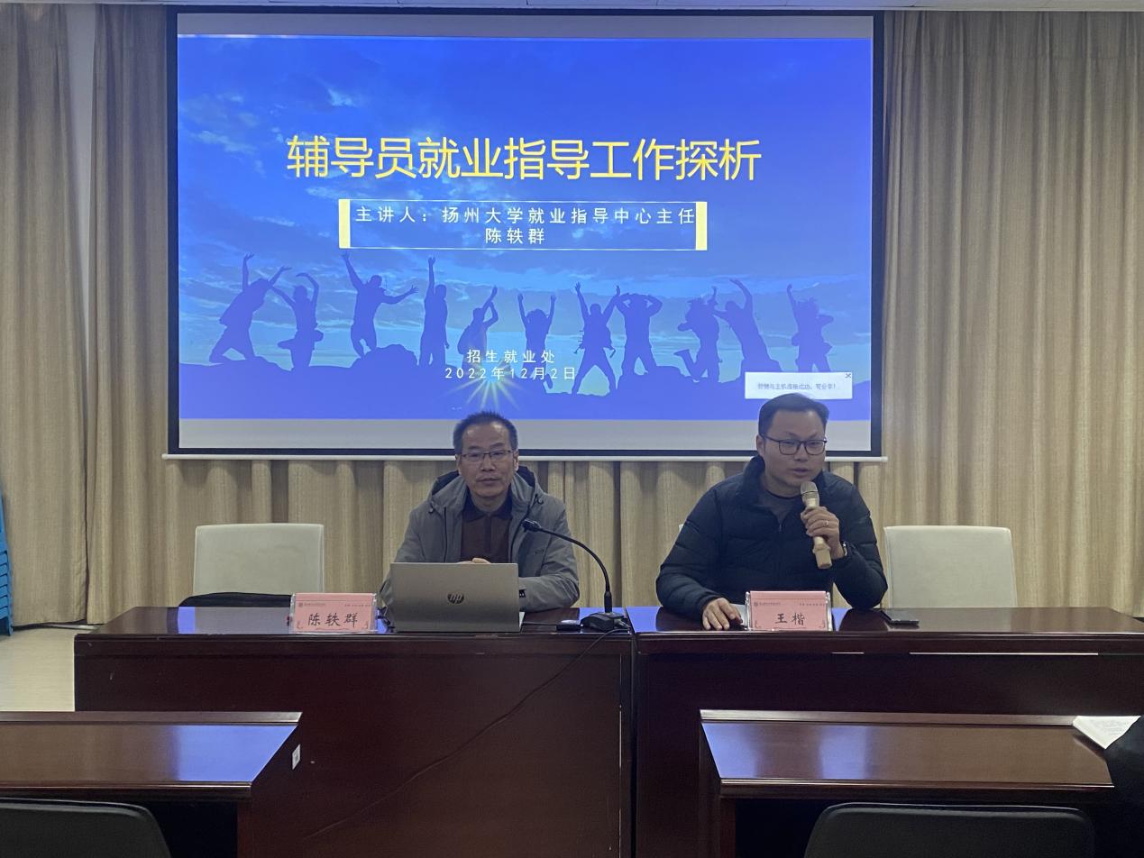 12月2日下午,德赢官网邀请扬州大学就业指导中心主任陈轶群给全体辅导员就“辅导员就业指导工作探析”作专题培训。培训活动在大学生活动中心招生就业指导大厅进行,招就处处长解厚荣、各二级学院党总支副书记、全体专职辅导员及招就处相关人员参加。活动由学院党委副书记王楷主持。