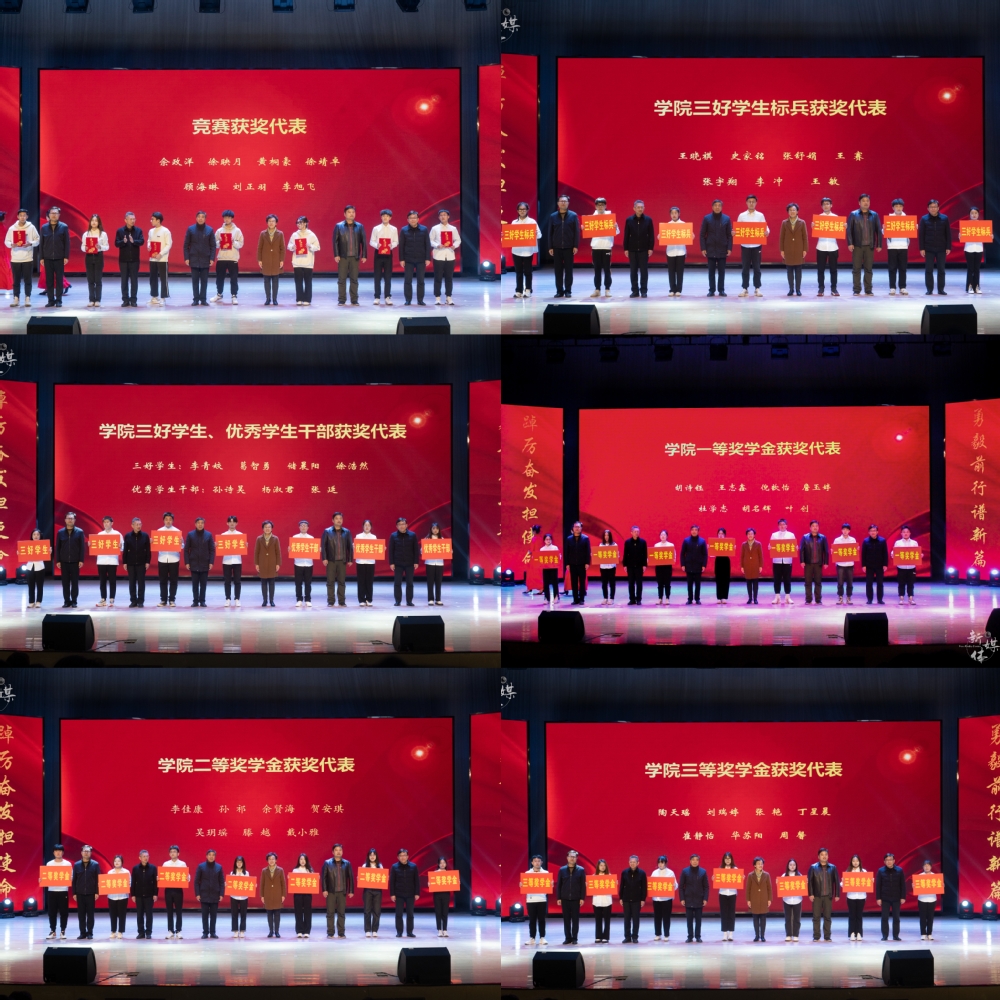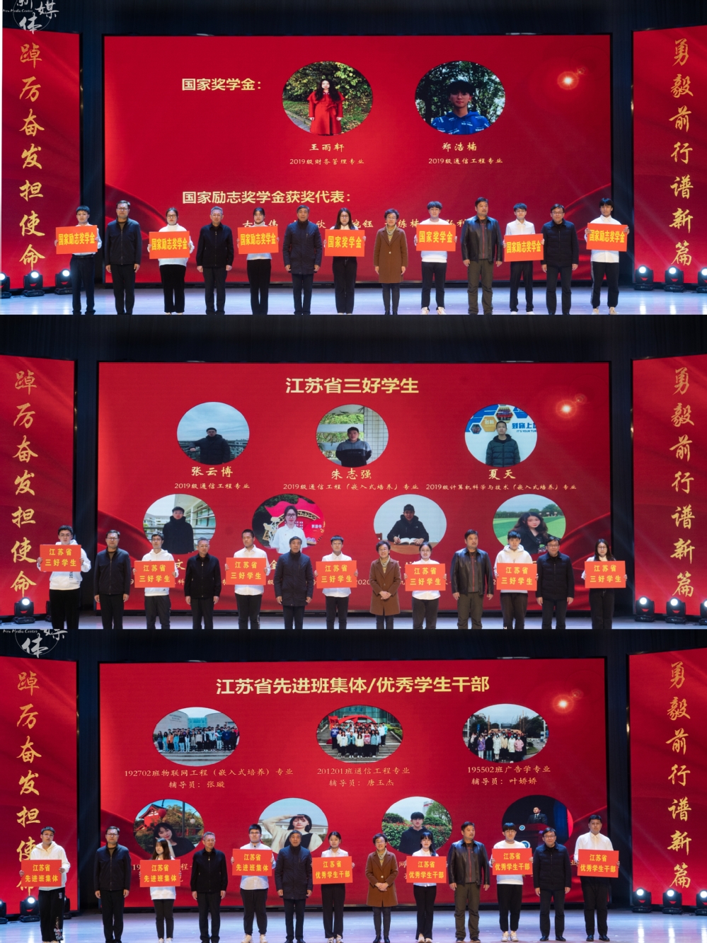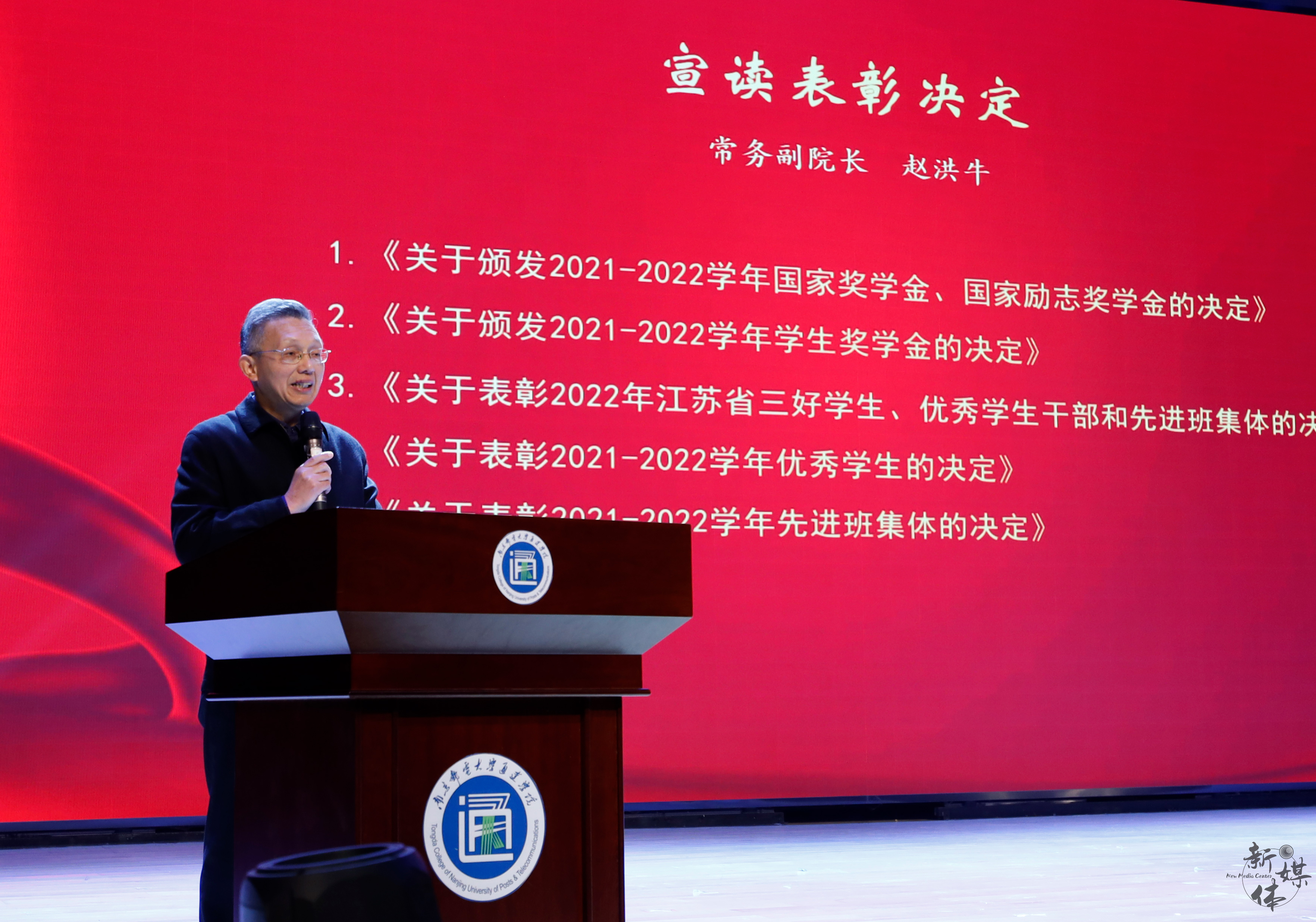 表彰环节由党委副书记、副院长王楷主持。常务副院长赵洪牛宣读了《关于颁发2021-2022学年国家奖学金、国家励志奖学金的决定》《关于颁发2021-2022学年学生奖学金的决定》《关于表彰2022年江苏省三好学生、优秀学生干部和先进班集体的决定》《关于表彰2021-2022学年优秀学生的决定》及《关于表彰2021-2022学年先进班集体的决定》。2021-2022学年,德赢官网共评出国家奖学金2人、国家励志奖学金178人、江苏省三好学生8人、江苏省优秀学生干部4人、江苏省先进班集体3个、院三好学生标兵65人、三好学生455人、优秀学生干部243人、一等奖学金279人、二等奖学金889人、三等奖学金1513人、技能成才奖100人、社会工作优秀奖320人、第二课堂活动优秀奖40人、学习进步奖1955人、帮扶之星奖609人、院先进班集体15个。表彰大会上,全体院领导为获奖的先进集体与优秀学生代表颁奖。