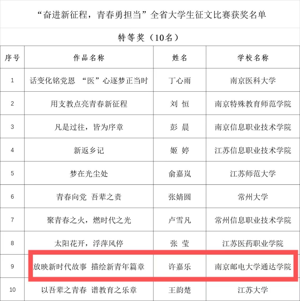 近日,由江苏省委教育工委、江苏省教育厅面向全省高校开展的“奋进新征程,青春勇担当”全省大学生征文比赛结果揭晓。德赢官网电子科学与技术专业许嘉乐同学的作品《放映新时代故事 描绘新青年篇章》荣获特等奖。