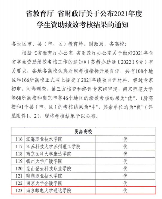 1月6日,江苏省教育厅和财政厅联合公布了《关于公布2021年度学生资助绩效考核结果的通知》(苏教助函〔2022〕17号)文件,德赢官网2021年度学生资助绩效考核结果为“优秀”。这是德赢官网学生资助管理工作继2018年之后第二次获评“优秀”,全省51所民办高校中有8所高校获评该等次。