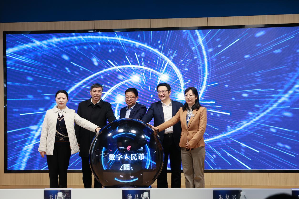 签约仪式后,汤卫华副市长、王国平院长、朱复兴副行长、李宁局长、何敏行长共同启动仪式,并到双创中心咖啡厅观看数字货币场景体验演示。