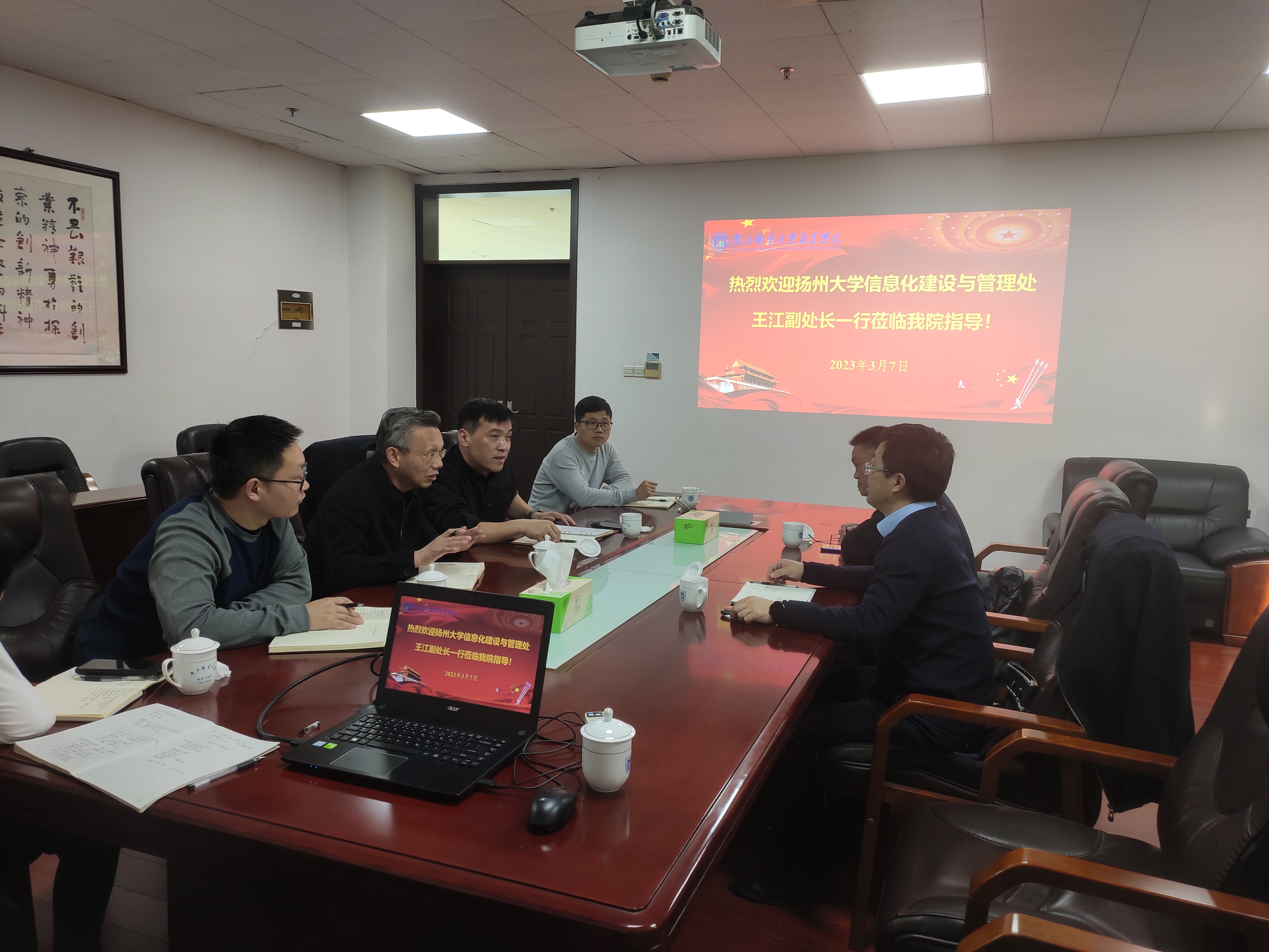 3月7日下午,扬州大学信息化建设与管理处王江副处长、印国成科长、陈锦禾副科长一行3人来德赢官网就高校信息化建设与发展工作进行调研交流。德赢官网常务副院长赵洪牛、教学保障处及网络中心等相关人员参加了调研交流会。