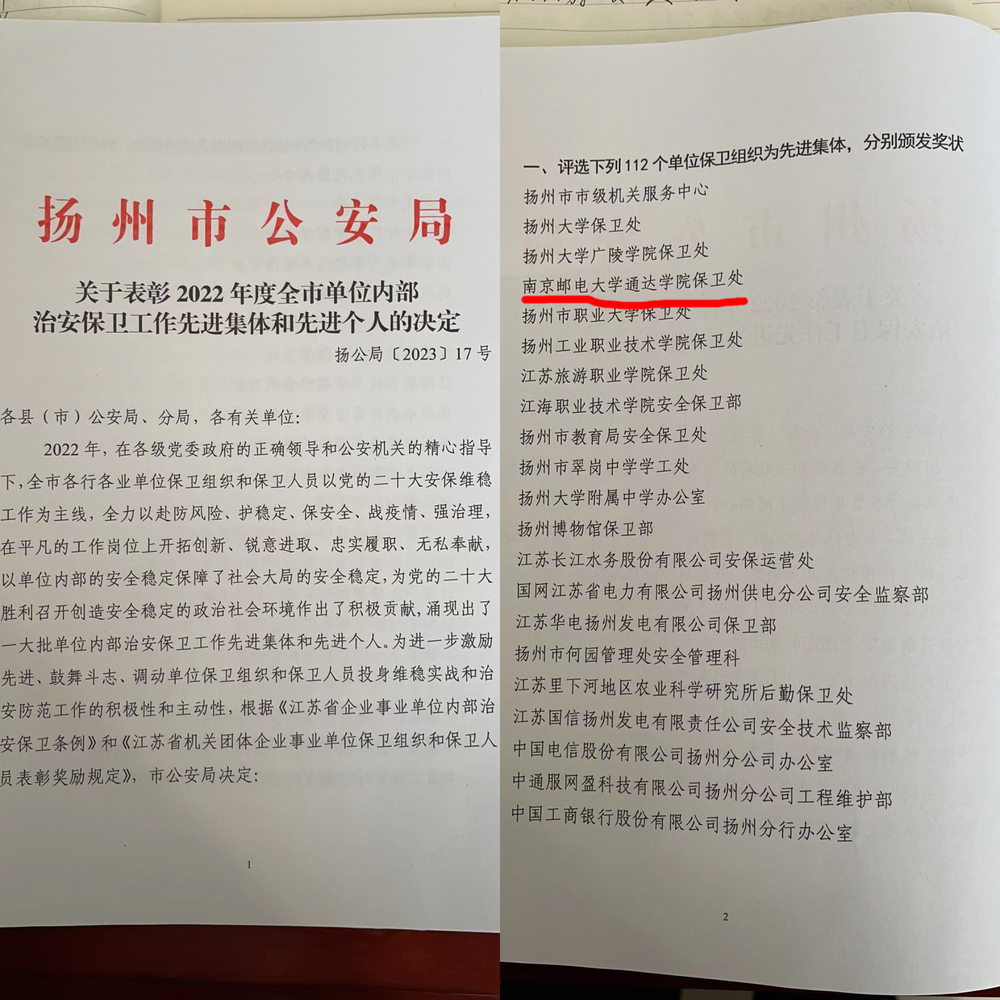 根据扬公局【2023】17号文件获悉德赢官网保卫处再次被扬州市公安局评为《2022年度全市单位内部治安保卫工作先进集体》。
