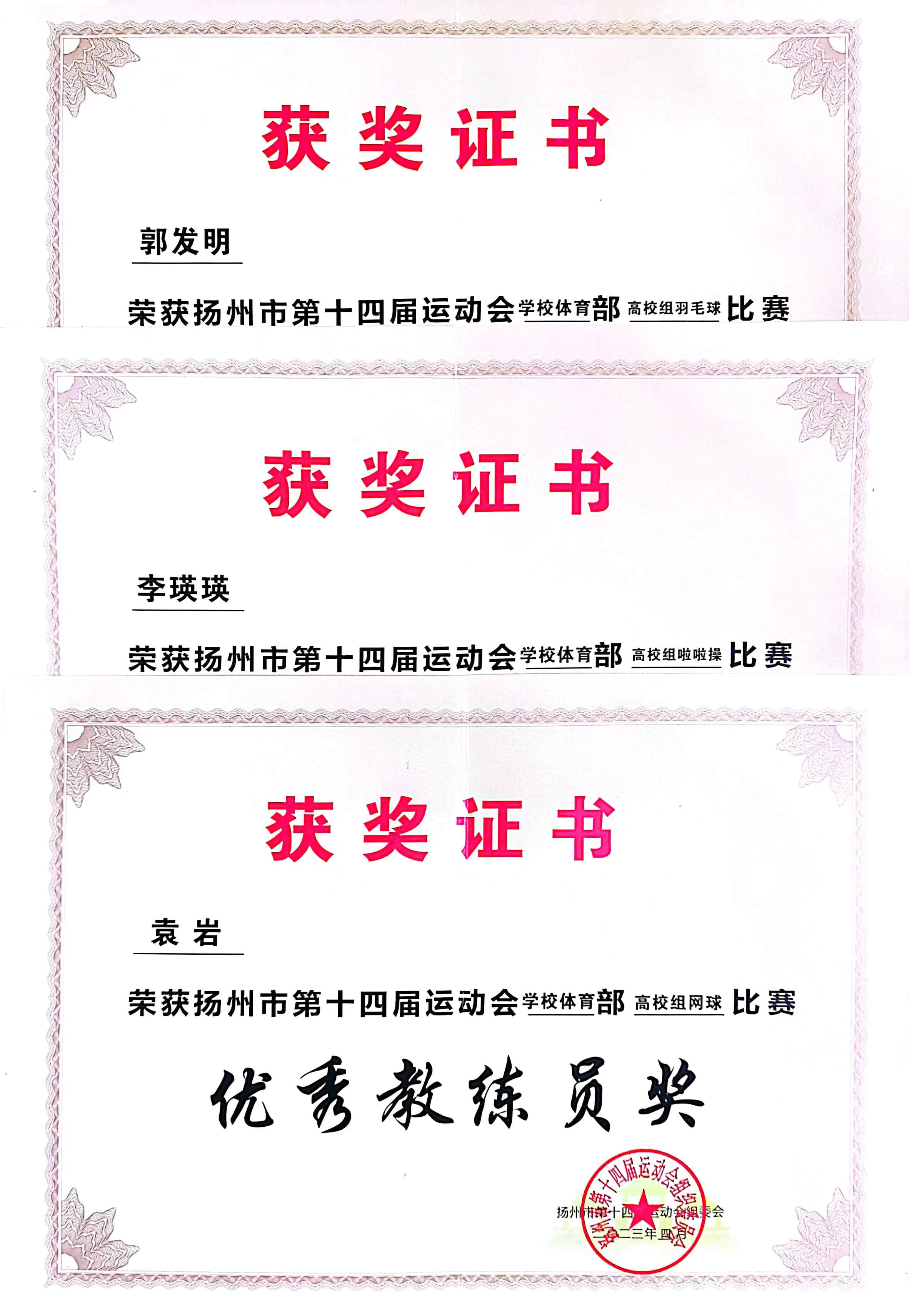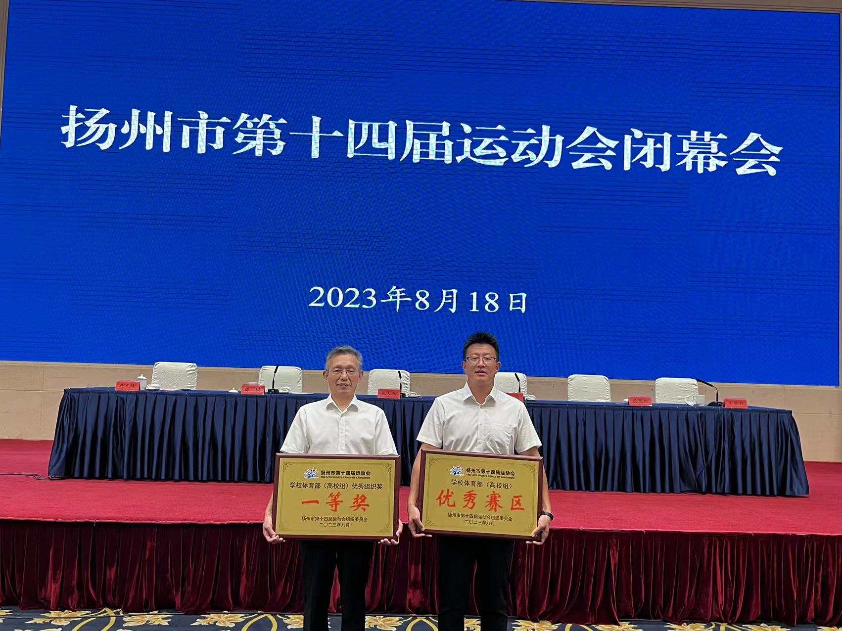 2023年8月18日下午,扬州市第十四届运动会闭幕式暨表彰大会在市会议中心举行,德赢官网代表团荣获高校部团体总分第一名,金牌榜第二名的佳绩,并获“优秀组织奖一等奖”、“优秀赛区奖”称号。德赢官网袁岩、李瑛瑛、郭发明三位教师荣获优秀教练员称号。