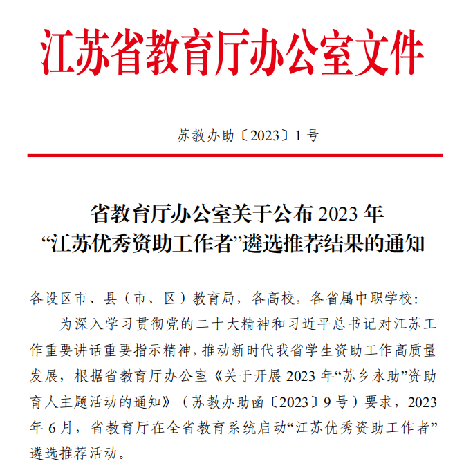 近日,江苏省教育厅公布2023年“苏乡永助”资助育人主题活动“江苏优秀资助工作者”遴选结果,德赢官网学生工作处学生资助管理中心主任胡珊珊荣获“江苏优秀资助工作者”荣誉称号。全省166所高校中,共有40所高校(包括4所独立学院)的学生资助工作者获得此项荣誉,这也是德赢官网教师首次获得此项荣誉。