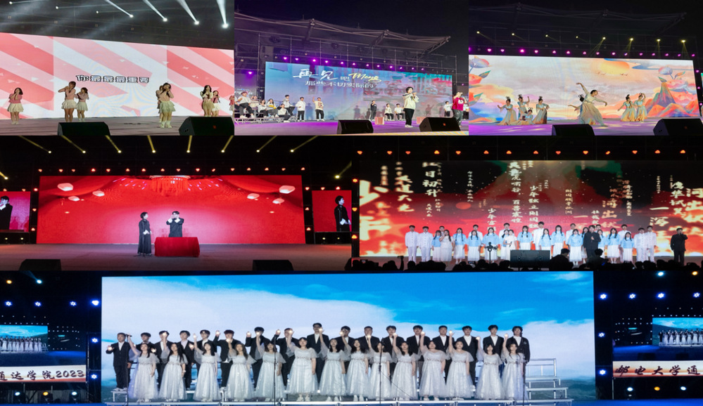 晚会上,一场场精彩表演精彩纷呈,展示了同学们突出的编排技巧和出色的表演能力,以及对中国优秀传统文化的把握与创新。其中《迎新》《可能》记录了新生入学报到、军训汇演、开学典礼、社团招新上的精彩瞬间,开启了美好且充满魅力的大学生活。《权御天下》以欢快的节奏引爆了全场气氛。舞蹈《寤俑》《你最最最重要》令人目不转睛。《中国少年说》更是用激昂的情绪让我们感叹“生于华夏,何其有幸”。相声作品《三打白骨精》让现场观众笑声连连。歌曲《和光同尘》和《回不去的夏天》让晚会达到了高潮。