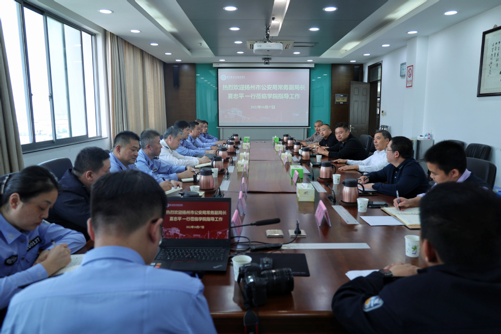 10月17日下午,扬州市公安局常务副局长夏忠平,扬州市邗江区副区长、区公安分局局长范红彬,内保支队、邗江分局等相关领导及专家一行莅临德赢官网调研指导工作。学院院长王国平,副院长倪可,学院办公室、保卫处、学工处等部门同志陪同调研。