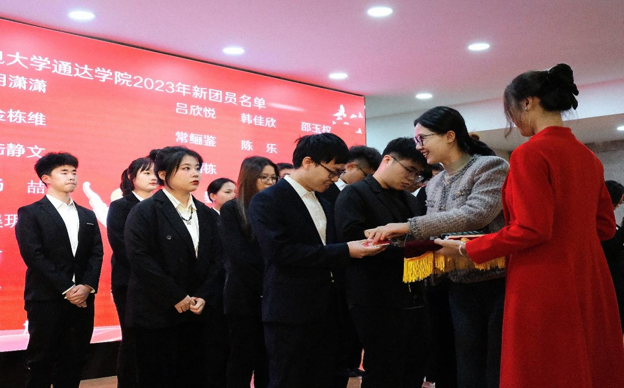 团委书记沈冰冰为新团员佩戴团徽并颁发团章、团员证