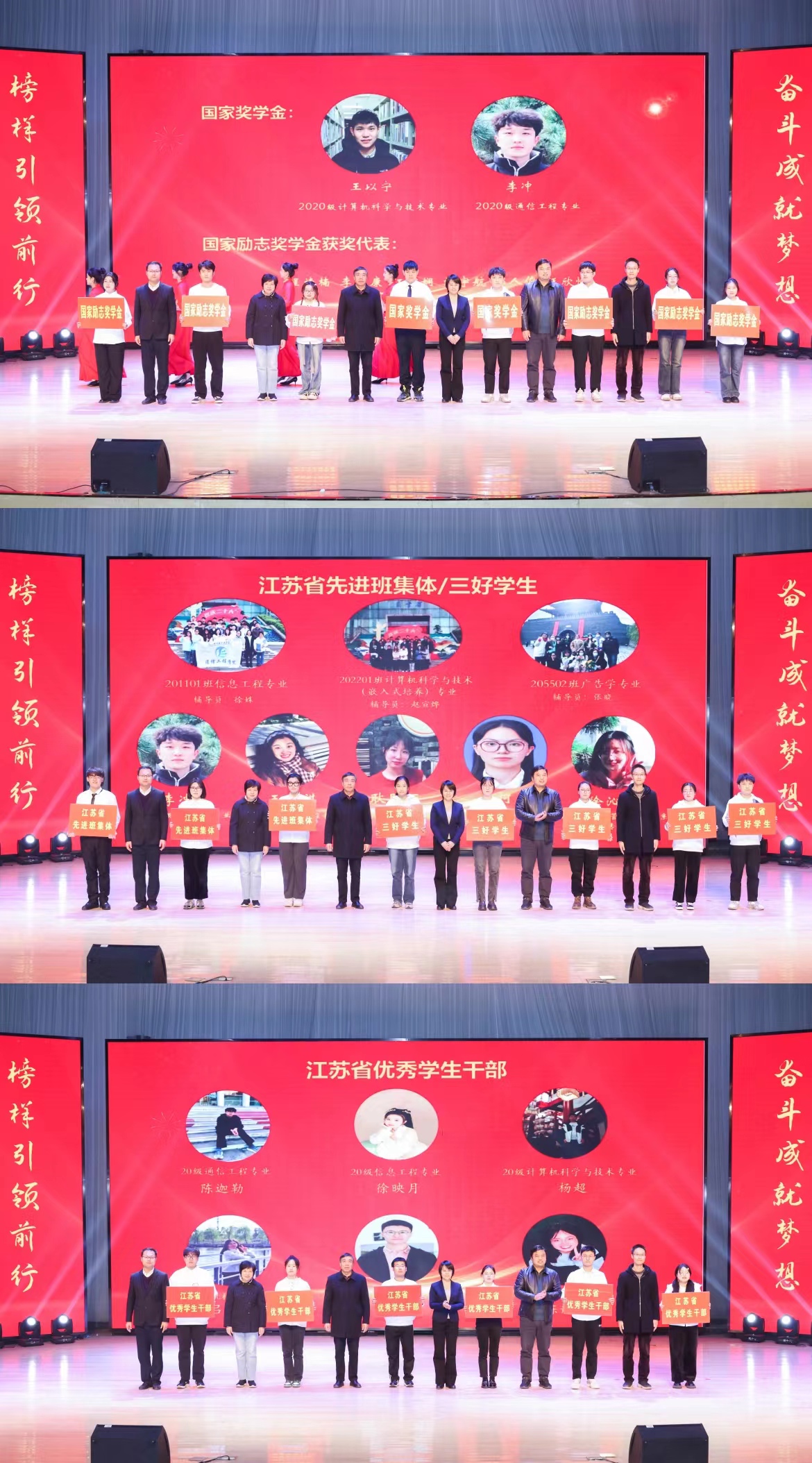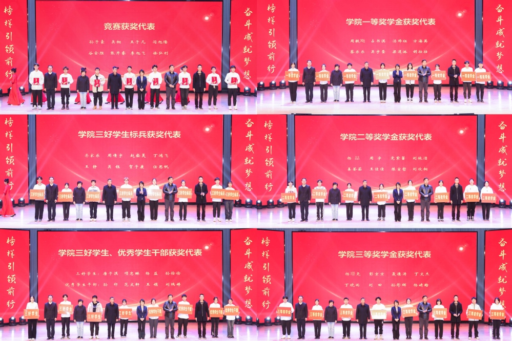 表彰大会分为表彰、分享、文艺汇演三个环节。表彰环节由党委副书记兼副院长王楷主持,副院长倪可宣读了表彰决定。2022-2023学年,德赢官网共评出国家奖学金2人、国家励志奖学金179人、江苏省三好学生5人、江苏省优秀学生干部7人、江苏省先进班集体3个、院三好学生标兵64人、三好学生457人、优秀学生干部244人、一等奖学金286人、二等奖学金919人、三等奖学金1646人、技能成才奖154人、社会工作优秀奖342人、第二课堂活动优秀奖47人、学习进步奖1293人、帮扶之星奖420人、院先进班集体24个。全体院领导为获奖的先进集体与优秀学生代表颁奖。