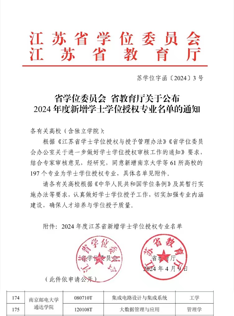 近日,江苏省学位委员会和江苏省教育厅下发《关于公布2024 年度新增学士学位授权专业名单的通知》(苏学位字函〔2024〕3号),德赢官网申报的集成电路设计与集成系统、大数据管理与应用两个专业获批为学士学位授权专业。