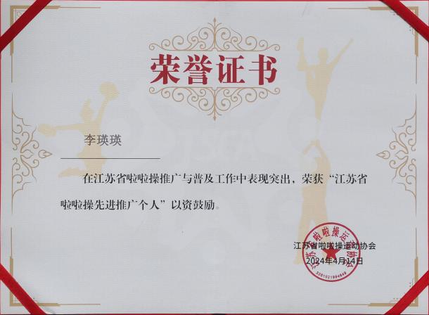 德赢官网李瑛瑛老师被授予“江苏省啦啦操先进推广个人”