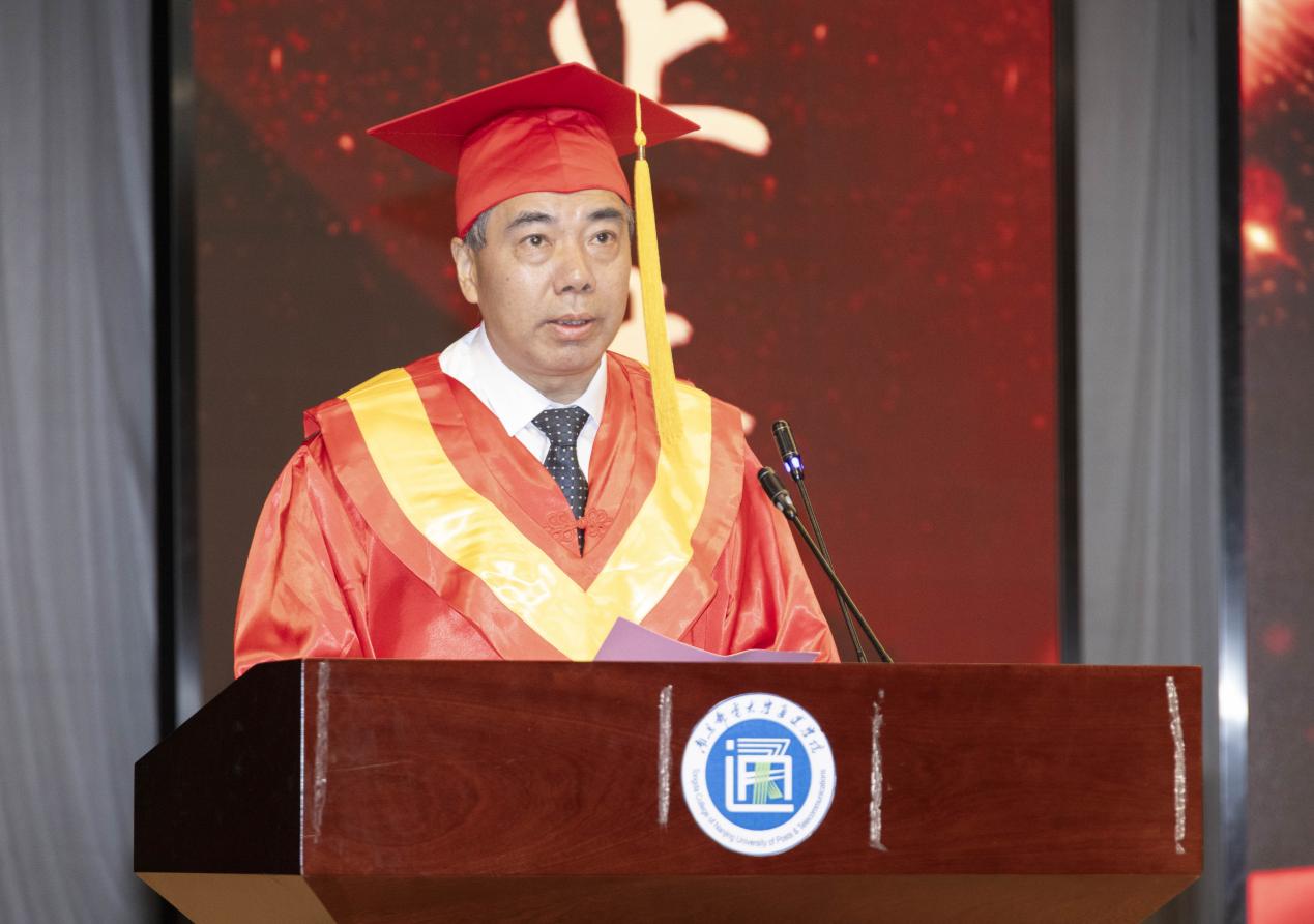 王国平院长致辞。他以“勇于担当作为,争当新时代大写青年”为题,感谢同学们以不懈的努力和执着的奋斗,助力学院综合实力持续提升、人才培养质量稳定保持、校园环境日益优美。勉励全体毕业生:一是胸怀祖国,做“想干事”的新时代大写青年,“苟利国家生死以,岂因福祸避趋之”,希望同学们坚守理想信念,立志成为“想国家之所想、急国家之所急、应国家之所需”的新时代青年;二是勤学善思,做“能干事”的新时代大写青年,“学须静,才须学,非学无以广才”,希望同学们继续博学真理,善学道理,悟学情理;三是百折不挠,做“干成事”的新时代大写青年,“千磨万击还坚劲,任尔东西南北风”希望同学们不惧未知、百折不挠,让青春在挺膺担当中绽放绚丽之花。