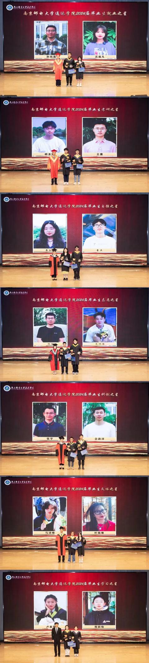 德赢AC米兰中国官方网站党委常委、副校长谢平和院领导为2024届毕业生之星颁发证书。为专业学习、文化体育、科技创新、志愿服务、自立自强、考研升学、求职就业等方面表现突出的14名同学颁发奖杯和毕业纪念品。