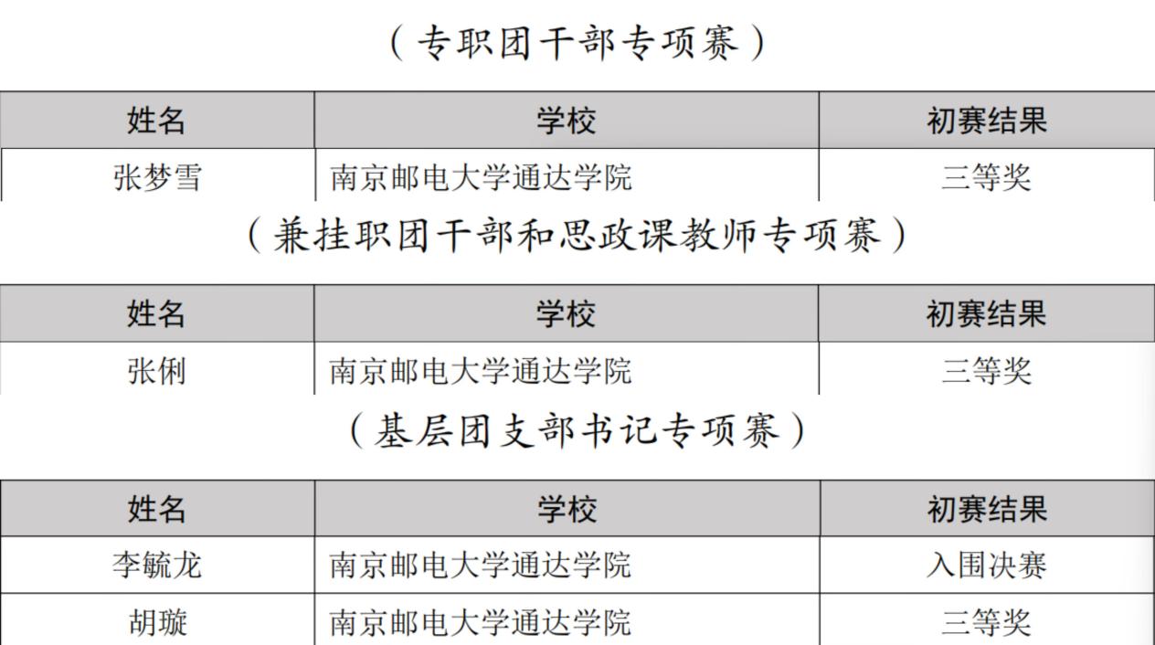 近日,第四届江苏高校百校万名团干部思政技能大比武初赛结果公布,德赢官网张梦雪老师荣获专职团干部专项赛三等奖,张俐老师荣获兼挂职团干部和思政课教师专项赛三等奖,胡璇同学荣获基层团支部书记专项赛三等奖,李毓龙同学在基层团支部书记专项赛中晋级决赛。这是德赢官网在此赛事中取得的最好成绩,也是首次有德赢官网学子入围决赛。