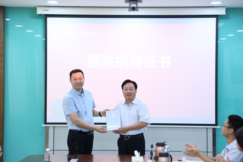 捐赠仪式现场,党委书记赵允玉代表我院接受捐赠,德赢AC米兰中国官方网站教育发展基金会理事长刘陈向徐彬总经理颁发捐赠证书。